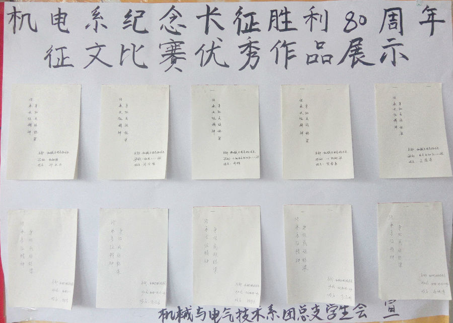今年是中国工农红军二万五千里长征胜利80周年,为深切缅怀革命先辈的丰功伟绩,学习和弘扬长征精神,深入培育和践行社会主义核心价值观,机械与电气技术系于10月9日-21日面向系部全体员工开展了以“传承长征精神,争做民族栋梁”为主题的征文活动。