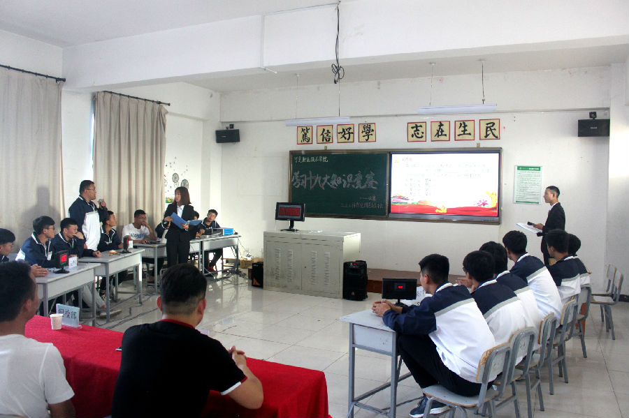 本次知识竞赛初赛以班级为单位,使用蓝墨云班课APP进行线上答题,根据成绩排名的前12名选手进入了决赛环节,通过抽签的方式组成了4支队伍。决赛共设置必答题、抢答题和风险题三个环节,涵盖了十九大报告、习近平总书记系列重要讲话等内容。活动还设置了观众互动答题环节,在活跃了现场比赛气氛的同时也增加了同学们参与学习的热情。经过激烈角逐,最终由2017级汽修1班魏思齐、2017级电气1班张永丰、2017级焊接班张文鑫同学组成的“超越队”获得冠军。