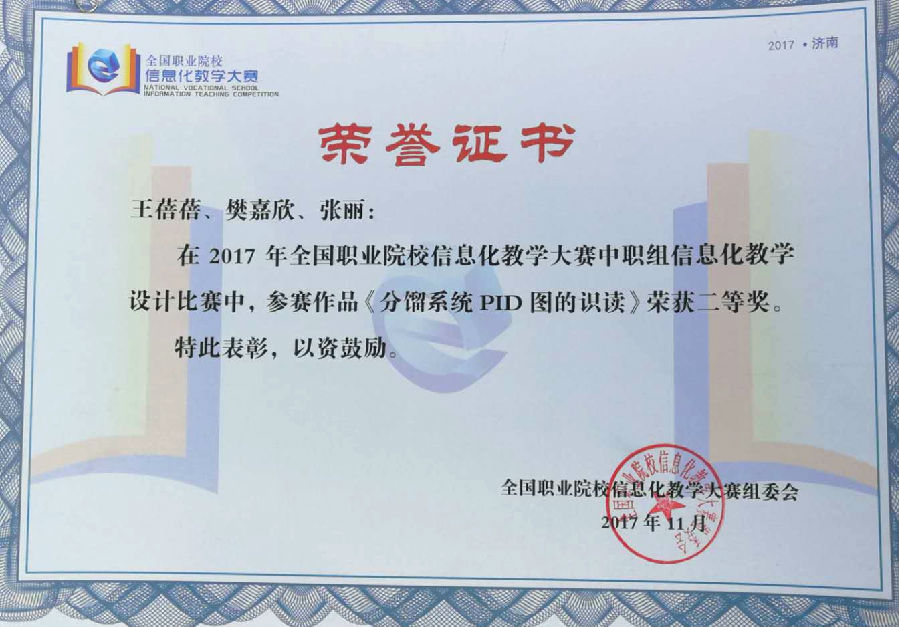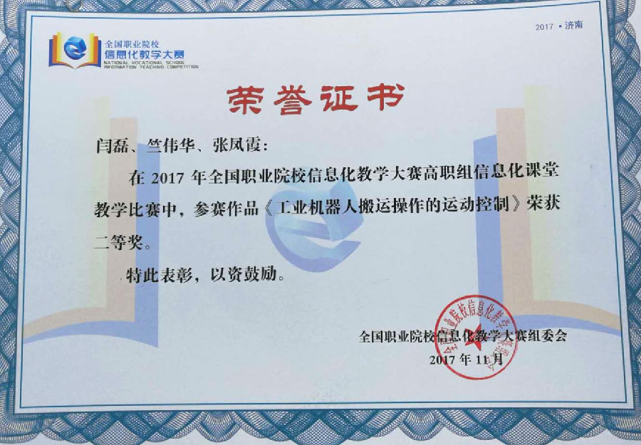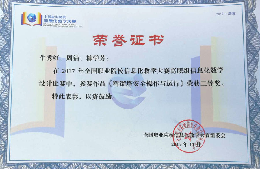 根据全国信息化教学大赛要求,3377体育积极筹备,认真组织动员教师积极参赛。在历时八个月的准备阶段,参赛教师们从最初的被动到主动,克服重重困难,顶住各种压力,积极备赛,一次次不厌其烦地修改课件和讲稿,经历了无数个日日夜夜。最终,闫磊、竺伟华、张凤霞团队的《机器人搬运的运动控制》作品获高职组课堂教学项目二等奖;牛秀红、周洁、柳学芳团队的《精馏塔安全操作与运行》作品获高职组教学设计项目二等奖;王蓓蓓、樊嘉欣、张丽团队的《分馏系统PID图的识读》获中职教学设计项目二等奖;陈官、张彩芬、蔡春林团队的《零件尺寸测量》获高职实训教学项目三等奖。