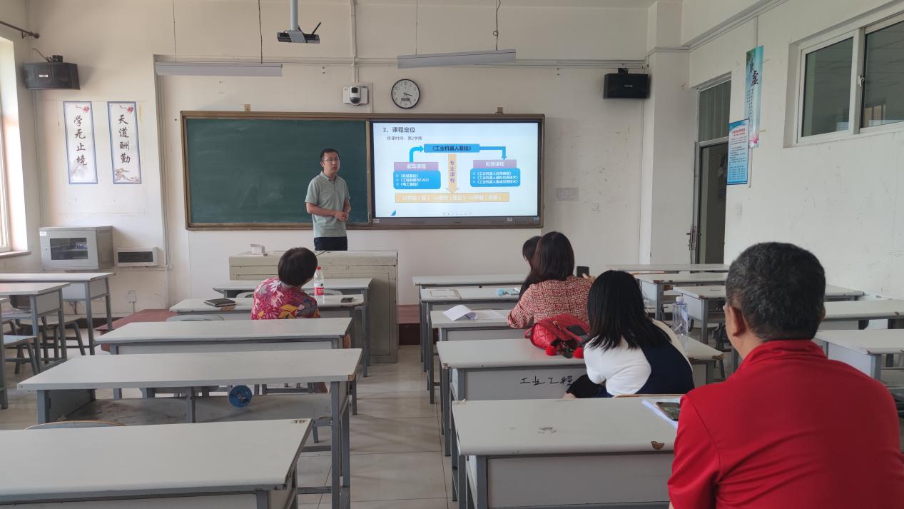 闫磊老师进行《工业机器人基础》课程说课,分课程简介、课程定位、课程实施、课程反思四个方面进行了课程介绍。
