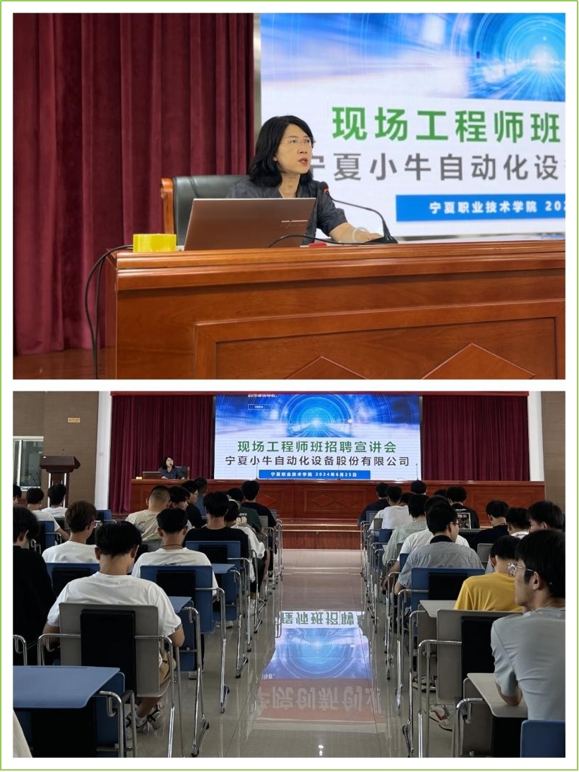 为贯彻落实《教育部办公厅等五部门关于实施职业教育现场工程师专项培养计划的通知》(教职成厅〔2022〕2号)和《自治区教育厅工业和信息化厅关于开展第一批现场工程师专项培养计划项目申报工作的通知》(宁教函〔2023〕416号)精神,聚焦区域产业发展,加快培养更多适应新质生产力发展的高素质技术技能人才,3377体育联合宁夏小牛自动化股份有限公司共同申报并获批了自治区“现场工程师专项培养计划项目。2024年6月25日,在3377体育竞贤楼校企联合召开了“小牛-宁职现场工程师专项培养计划”宣讲会。3377体育副经理张彩芬、机械教研室主任蔡春林出席宣讲会,2023级机电一体化技术全体员工及辅导员参加了会议。