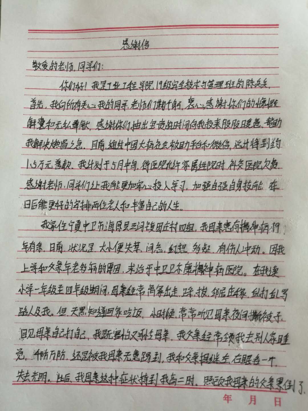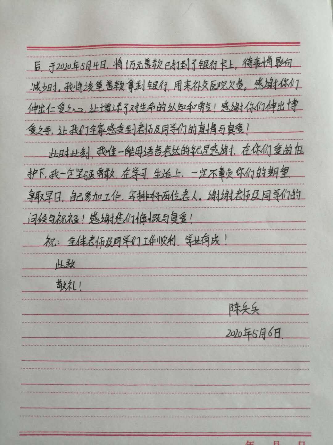 陈兵兵同学得到党组织的关爱,写了一封热情洋溢的感谢信,对全院师生深表谢意,表示不辜负大家的关心与帮助,志存高远,将这种无私的博爱传递下去,服务社会,温暖人间。疫情期间,他积极参加志愿者服务活动,刻苦学习,用实际行动诠释了感恩回报情怀。