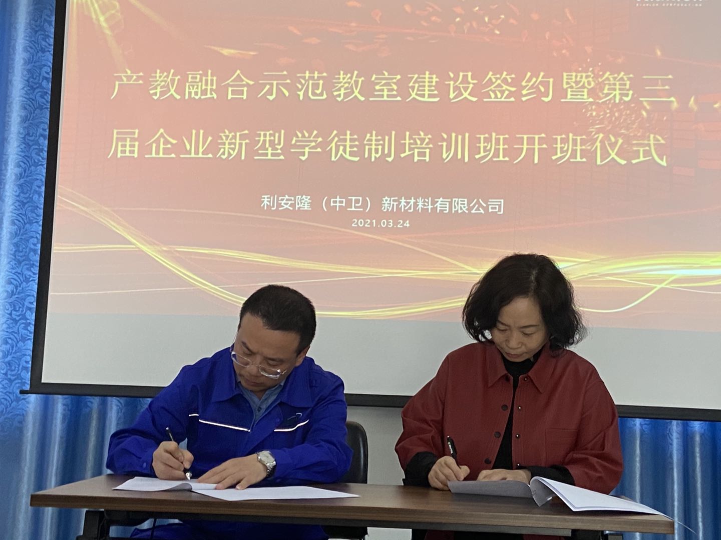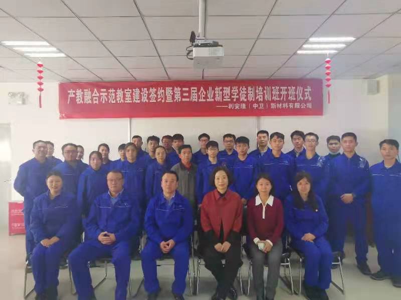 在开班仪式上利安隆(中卫)新材料有限公司公司总经理熊昌武与工公司经理李慧云签订了第三届企业新型学徒制培训协议,工公司后续对43名员工开展有机合成工工种的技能培训及鉴定工作。(文/图 于建君)