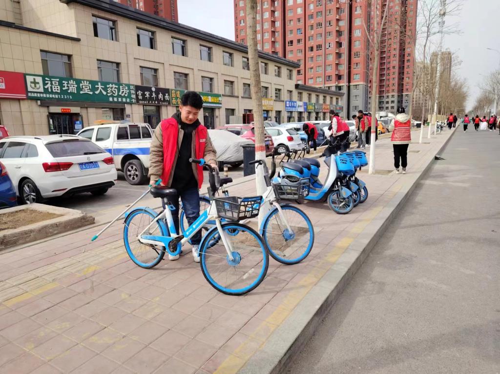 随后在社区工作人员的带领下,志愿者们分成若干小组,深入社区开展清洁活动。他们手持扫把、垃圾袋等工具,对社区内的道路、绿化带等区域进行了全面清扫,并将公共区域共享单车摆放整齐,用心为社区居民做好服务。在志愿者们的共同努力下,社区环境焕然一新,展现了新时代社区居民的良好精神风貌。
