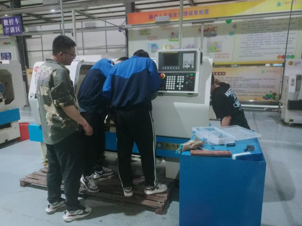 员工在老师指导下安装数控车床照明灯