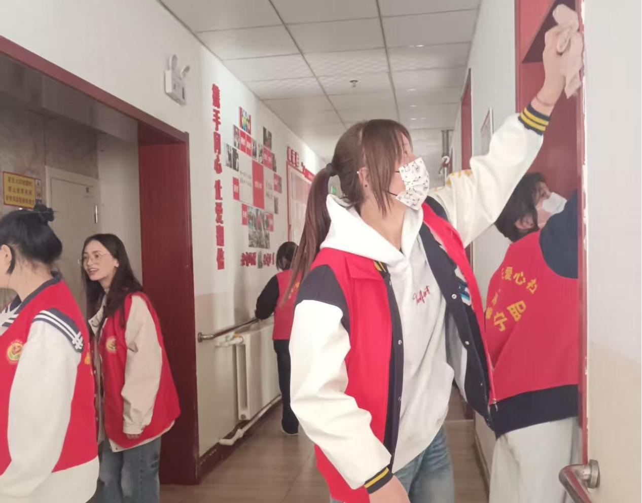在公共活动区域,另一组志愿者化身“环境美容师”,对养护中心进行全面清洁。他们手持抹布仔细擦拭门窗玻璃,弯腰清理卫生死角,将活动室的棋牌桌椅摆放整齐。