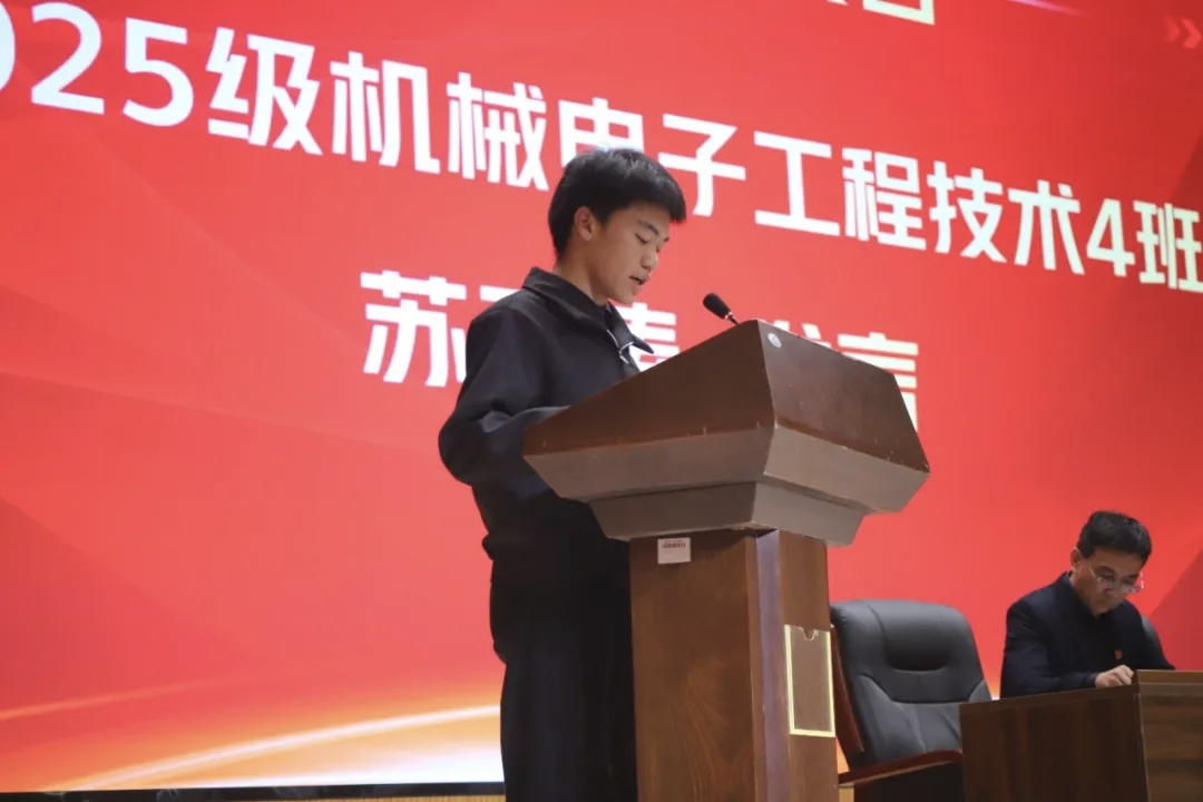2025级机械电子工程技术4班员工苏玉涛作为新生代表发言。他分享了自身的求学经历,讲述自己选择机械电子工程技术专业的原因,并分享了入校以来的感受,他号召全体新生努力成为既有理论素养,又有实践能力的复合型人才,展现出第一届本科员工的风采与水准,为公司的发展贡献自己的力量。