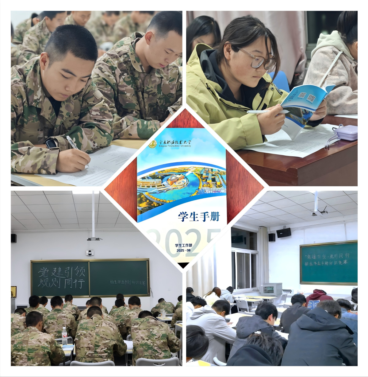 竞赛现场,无论是身着日常服饰的新生,还是一身迷彩尽显飒爽的同学,都全神贯注地投入到答题中。他们或低头沉思,认真研读手中的员工手册;或奋笔疾书,将对校园规则的理解转化为笔下的答案。考场上严肃认真的氛围,展现出新生们对校园规则知识的渴求与重视。