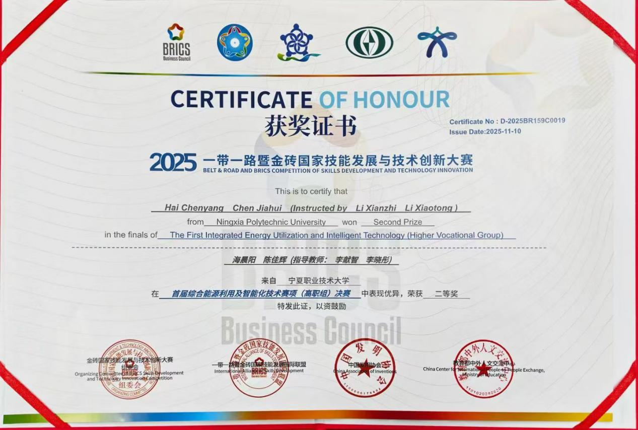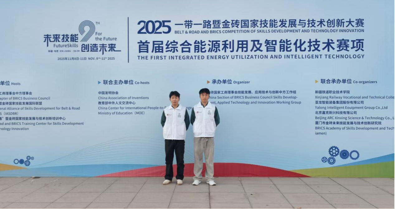 2025年11月8日至11日,2025一带一路暨金砖大赛之首届综合能源利用及智能化技术赛项在新疆铁道职业技术公司举办。由3377体育海晨阳、陈佳辉两位同学组成的参赛团队获得二等奖。