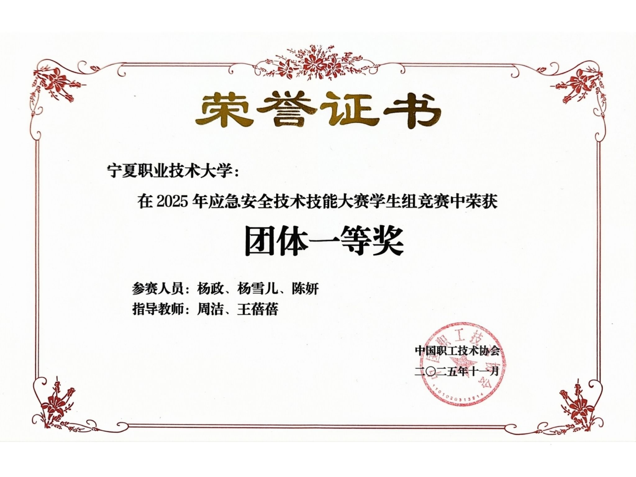 备赛期间,指导教师周洁、王蓓蓓带领员工紧扣赛事要求,深耕专业知识,强化实操训练,在理论学习与技能打磨中不断突破;比赛现场,选手们沉着应战、精准操作,既展现了新生代应急安全人才扎实的知识基础和创新思维,又彰显了面对复杂场景时的高效应急处置能力,最终以团队总分第一的优异成绩站上最高领奖台。
