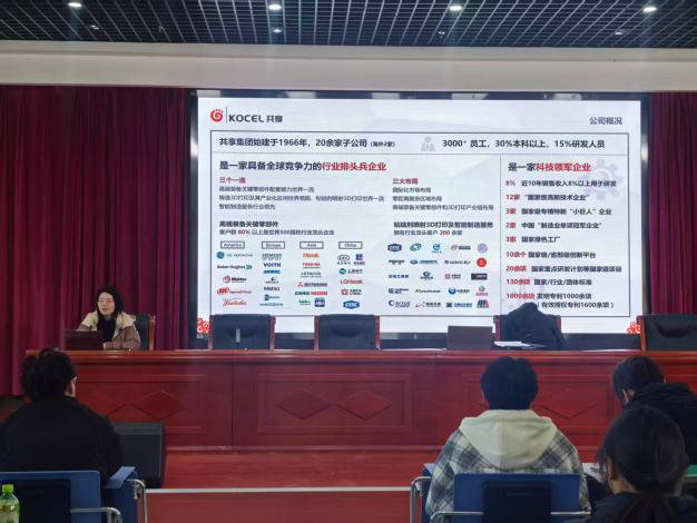 在企业宣讲环节,宁夏共享智能装备有限公司、宁夏乔锋机械制造有限公司和宁夏科德数控科技有限公司代表依次宣讲,分别从企业历史及其文化、主营业务、岗位需求、发展前景和福利待遇等方面进行介绍,并对公司现场工程师班培养提出了企业解决方案。