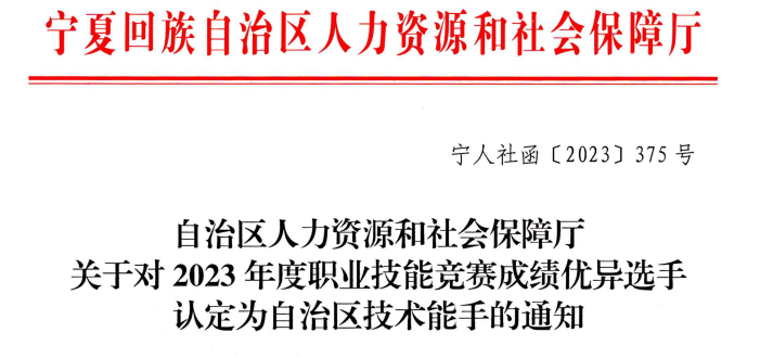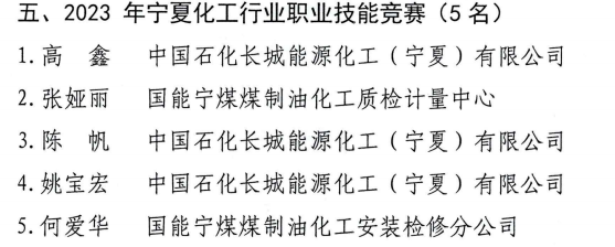 2023年12月27日“自治区人力资源和社会保障厅关于对2023年度职业技能竞赛成绩优异选手认定为自治区技术能手的通知”(宁人社函【2023】375号)文件中,公司安全技术与管理专业群18级应用化工技术专业毕业生高鑫、18级煤化工技术专业毕业生陈帆在2023年宁夏化工行业职业技能竞赛中代表中国石化长城能源化工(宁夏)有限公司参赛队比赛,分别获得化工总控工和工业废水处理工个人成绩第一名,根据《宁夏职业技能竞赛管理办法》被授予且认定为“自治区技术能手”,并破格晋升为技师且被公司聘任为技师职位,享受技师工资补贴待遇,至此,双高建设三年来,公司安全技术与管理专业群“职业技能竞赛团队”的毕业生实习就业后,以扎实的专业知识、精湛的专业技能、良好的竞赛素养,经过企业层层严格选拔,最后脱颖而出,先后入选中国石化长城能源化工(宁夏)有限公司、国家能源集团宁夏煤业集团公司、四川泸天化集团宁夏和宁化学有限公司等企业代表队奋战在全国石油化工行业职业技能大赛、宁夏化工行业技能大赛、国家能源集团技能大赛、四川省化工行业技能大赛等企业国赛、省赛、企业技能大赛赛场,先后获得全国石油化工行业职业技能大赛化工总控工二等奖2人、三等奖3人、国家能源集团技能大赛化工总控工三等奖3人,宁夏化工行业技能大赛化工总控工一等奖2人、二等奖1人、三等奖3人,工业废水处理工一等奖1人,四川省化工行业技能大赛化工总控工二等奖1人,三年来共获得“自治区技术能手”3人、国家能源集团“青年岗位技术能手”1人,国家能源集团宁夏煤业集团公司“宁煤工匠”1人,国家能源集团宁夏煤业集团公司“青年岗位技术能手1人”,“宁东工匠”1人,宁职化工专业毕业生厚植“三种精神”,传播大赛文化,秉承“一技在身、技行天下”的职业信仰,以“敢于拼搏,勇于创新、实干兴企”的新时代化工产业工人的良好风貌诠释了“技能宝贵、劳动光荣、创造伟大“的”技能强国有我”的“宁职学子风采”,值此元旦佳节来临之际,向母校全体师生报喜,并感谢宁职3377体育化工老师们的辛勤培育和“周洁技能大师工作室”校企混编大师团队们的一路培养指导和谆谆教诲,我们定将不负众望,在岗位上孜孜追求,不忘初心,再接再厉,继续奋斗前行。
